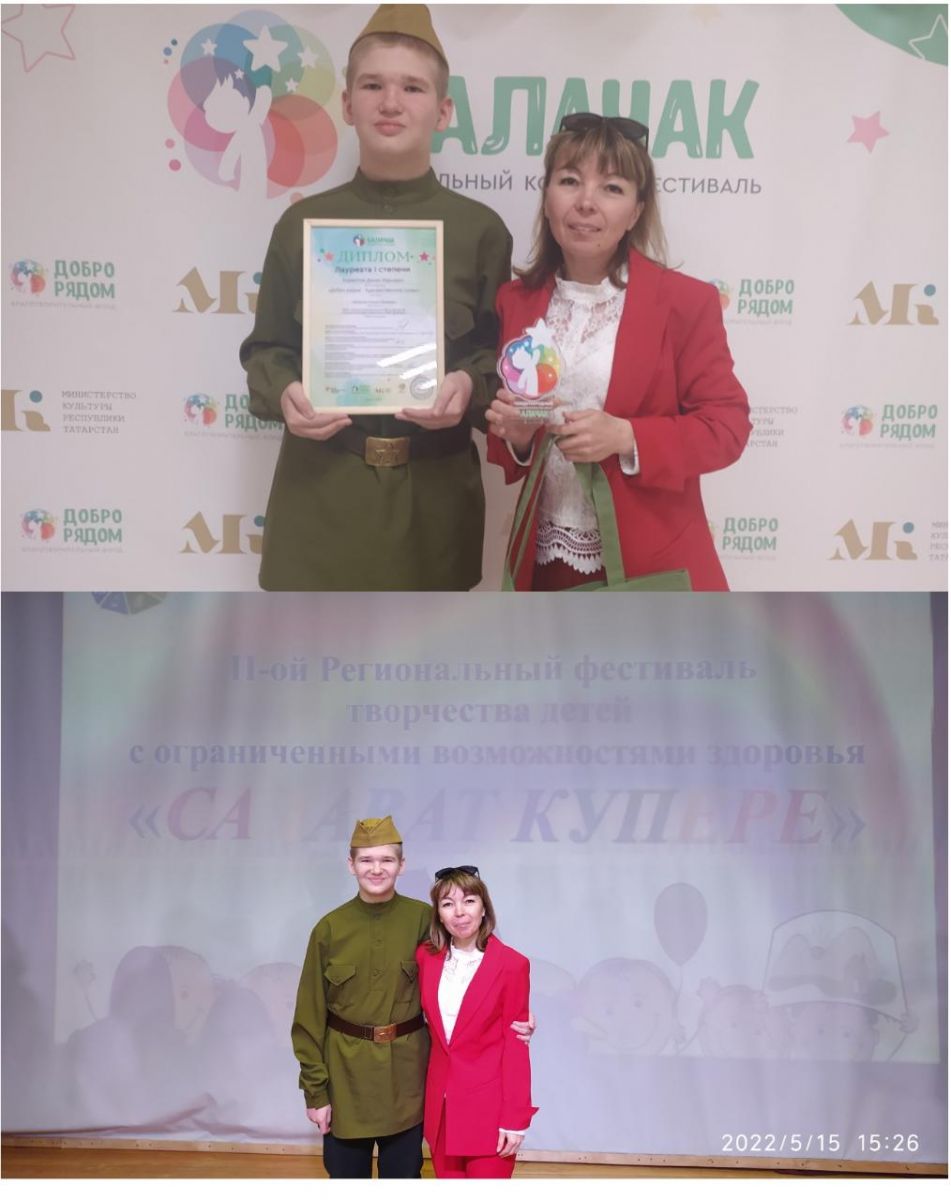 14, 15 мая наш ученик Бормотов Данил под руководством Гайнановой А. Л. участвовал в городе Казань в конкурсах "Салават Купере" (ll региональный фестиваль творчества детей с ОВЗ) и в международном вокальном конкурсе- фестиваль "Балачак", где стал лауреатом l степени. Поздравляем Данила и руководителя с высокими наградами, желаем дальнейших успехов!
