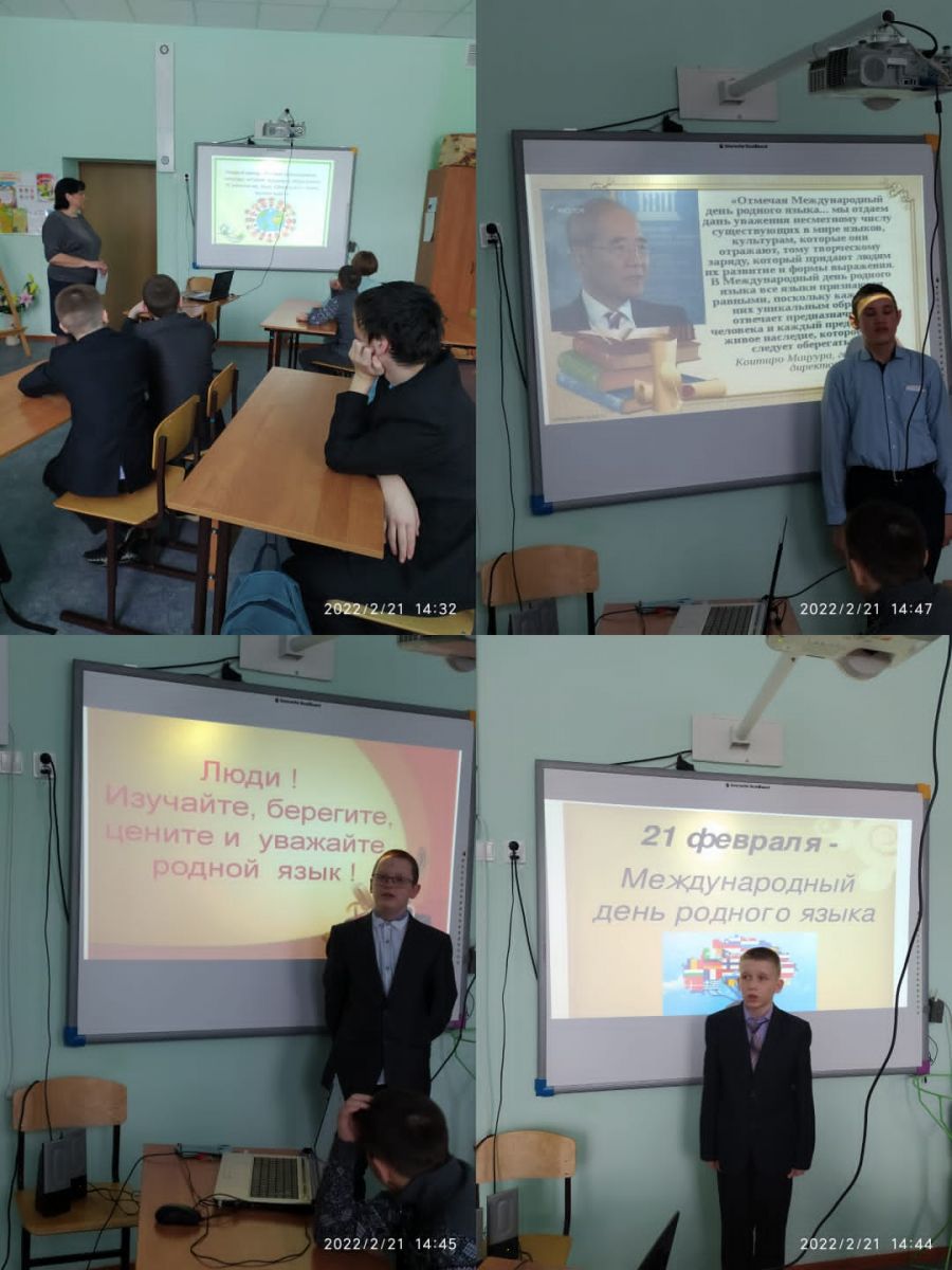 21 февраля с 2000 года во всем мире отмечается Международный день родного языка, который был введен с целью сохранения и развития исчезающих языков. Всего в мире существует около 6 тысяч языков, из них половина – на грани исчезновения. Россия – многонациональное государство. Каждая нация – это неповторимая культура, история, традиции и, конечно же, язык. Более 130 языков звучат в нашей стране. Учитель русского языка, Антипова Н. Н., и учитель родного языка Гайнанова А. Л. провели для учащихся 6 и 7 классов внеклассное мероприятие "Гордость народа- родной язык". Дети читали стихи на русском и татарском языках. Отгадывали загадки, продолжали пословицы и поговорки.