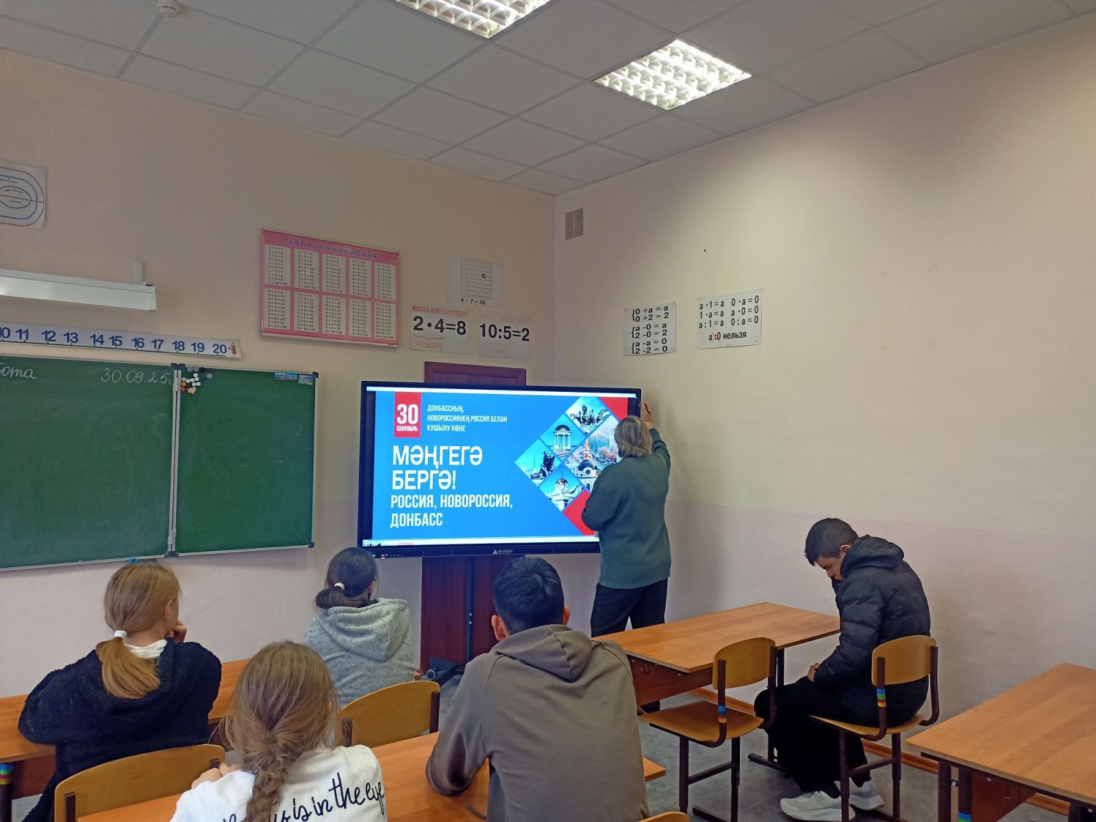 30 сентября – День воссоединения Луганской, Донецкой Народных Республик, Херсонской и Запорожской областей с Россией. Федеральным законом устанавливается новая памятная дата России – 30 сентября – День воссоединения Донецкой Народной Республики, Луганской Народной Республики, Запорожской области и Херсонской области с Российской Федерацией (2022 год).Три года назад жители этих регионов на референдумах сделали свой выбор в пользу своей исторической Родины. Они проголосовали за возможность свободно говорить на родном языке, знать и чтить свою настоящую историю, развиваться и иметь возможность строить планы на будущее. Сейчас по народной программе Единой России строятся современные школы и больницы, восстанавливаются дороги и жильё, благоустраиваются парки и многое другое. Об этом учитель истории Марисова М.С рассказала учащимся нашей школы на Уроке Мужества, который прошёл среди учащихся 6-9 классов. Дети познакомились с Героями РФ, отдавших жизнь за свободу и справедливость. Почтили память Минутой Молчания.