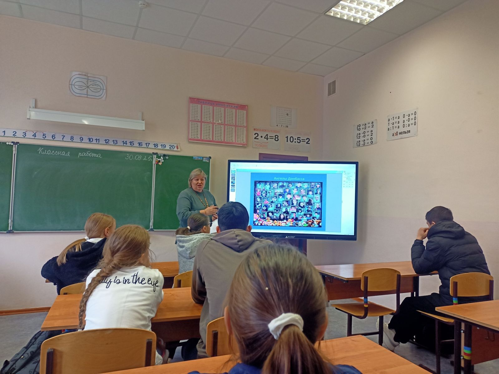 Учащиеся нашей школы посмотрели презентацию о памятнике «Детям войны» На скульптурной композиции мальчик смотрит в небо, прикрывая собой младшую сестрёнку. Прототипом для памятника стал 13-летний Кирилл Сидорюк, погибший при обстреле посёлка Буткевич в Луганской Народной Республик в августе 2014 года, но ценой жизни защитивший свою 9-летнюю младшую сестру Татьяну. Установлена на Аллее ангелов и открыта 2 июня 2017 года в донецком парке имени Ленинского комсомола. Укутайте Донбасс в тишину, Укройте мирным небом-словно пледом. Пусть отдохнет он, вопреки всем бедам. Пусть станет детский плач ему неведом. Этими слова закончился еще один Музейный урок.