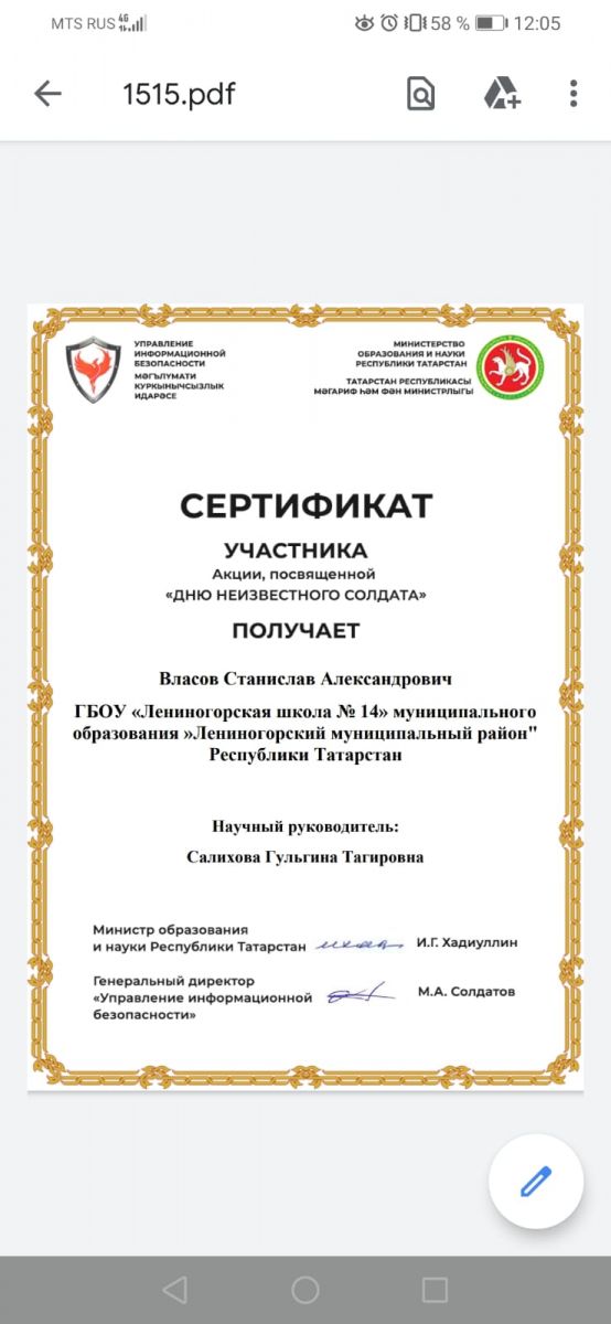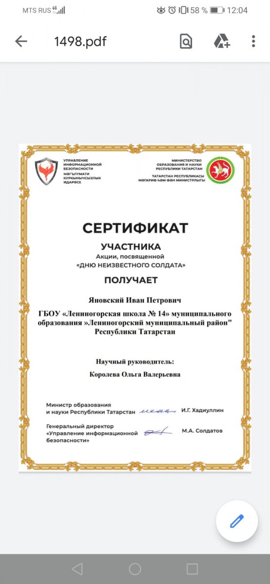 Цель акции: сохранение исторической памяти и ознаменование 76-летия Победы в Великой Отечественной войны 1941-1945 годов. Гражданско- патриотическое воспитание обучающихся общеобразовательных школ. Ученики нашей школы: Яновский Иван- руководитель Королева Ольга Валерьевна, Бормотов Данил- руководитель Гайнанова Альзира Ленаровна, Власов Станислав - руководитель Салихова Гульгина Тагировна, приняли активное участие и получили сертификат участника. Поздравляем!