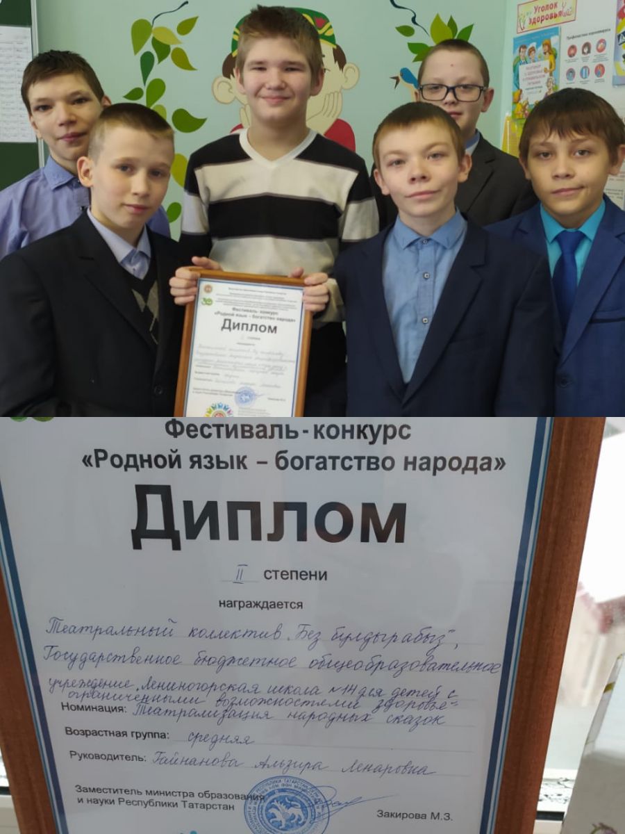 В период с 1 по 8 декабря по республике Татарстан был проведён фестиваль- конкурс "Родной язык- богатство народа". В конкурсе было 13 номинаций. В них приняли 507 работ. Наш школьный театральный коллектив " Без булдырабыз", 6А класса, (руководитель Гайнанова Альзира Ленаровна) в номинации "Театрализация народных сказок" стали победителями II степени. Награждения по итогам фестиваля проходила 24 декабря в МБОУ "Большекайбицкой СОШ- центр образования " Кайбицкого муниципального района РТ. Дорогие победители, мы вас сердечно поздравляем с победой, дальнейших успехов Вам!