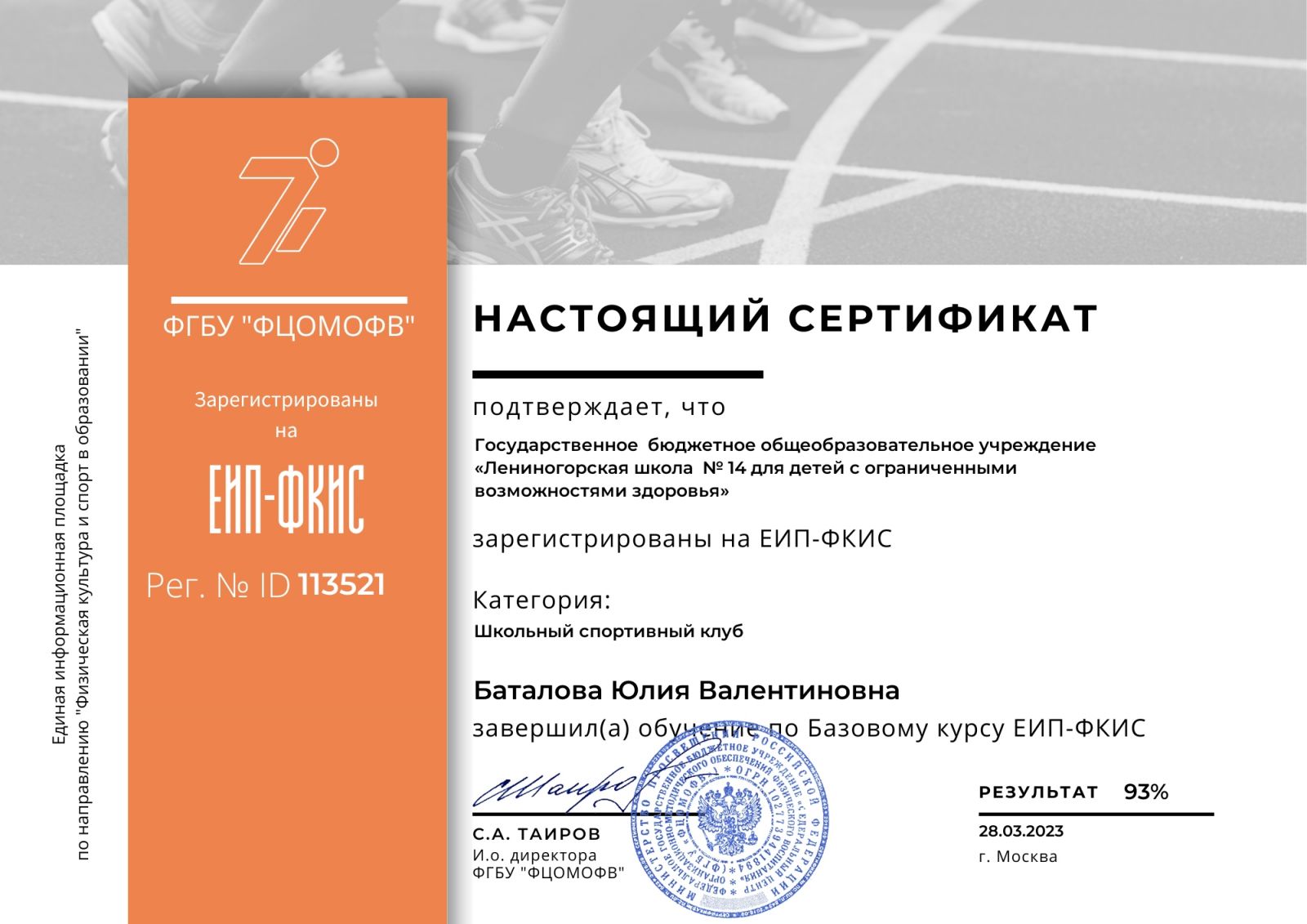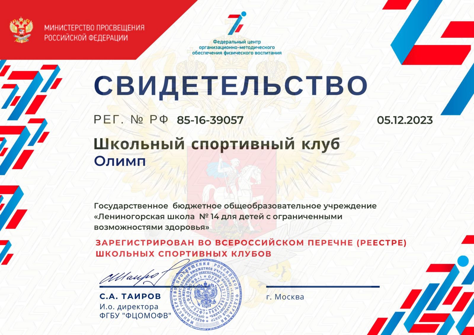 Свидетельство о регистрации во всероссийском перечне школьных спортивных клубов
