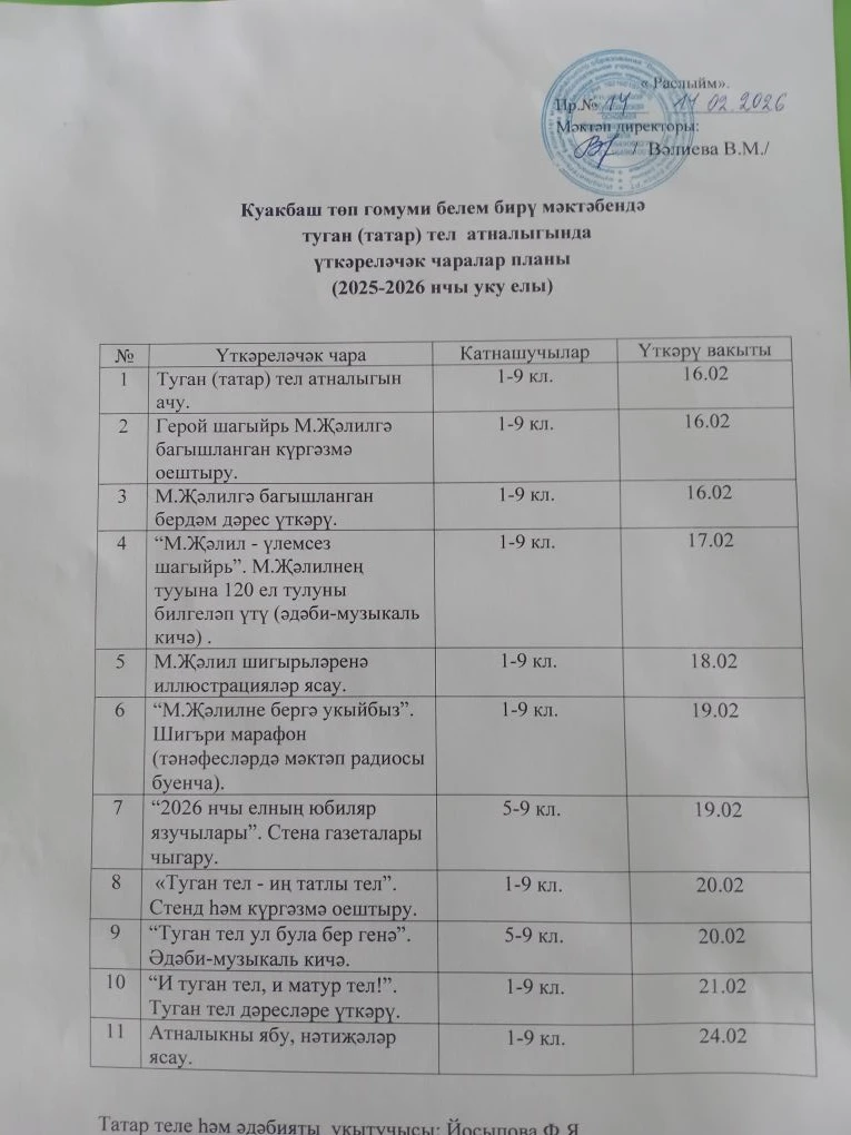 Бүгеннән мәктәбебездә туган (татар) тел һәм әдәбияты атналыгы башланып китте. Татар теле һәм әдәбияты укытучысы Йосыпова Ф.Я. атналыкның планы белән таныштырды. Үткәреләчәк чараларның күбесе М.Җәлилнең 120 еллыгына багышланачак. Бүген укучылар шагыйрьнең тормышына, иҗатына багышланган күргәзмәләр белән таныштылар, җыентыкларыннан шигырьләр укыдылар.