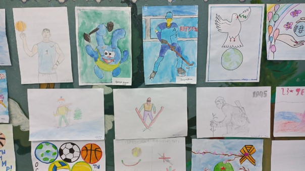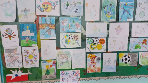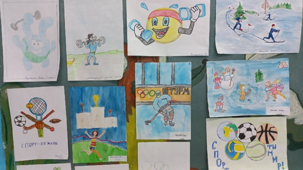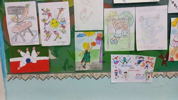 Продолжается военно-патриотический, спортивно-оздоровительный месячник. Учитель физкультуры Сабирзянов А.А. совместно с классными руководителями организовали выставку рисунков "Спорт-основа здоровья".