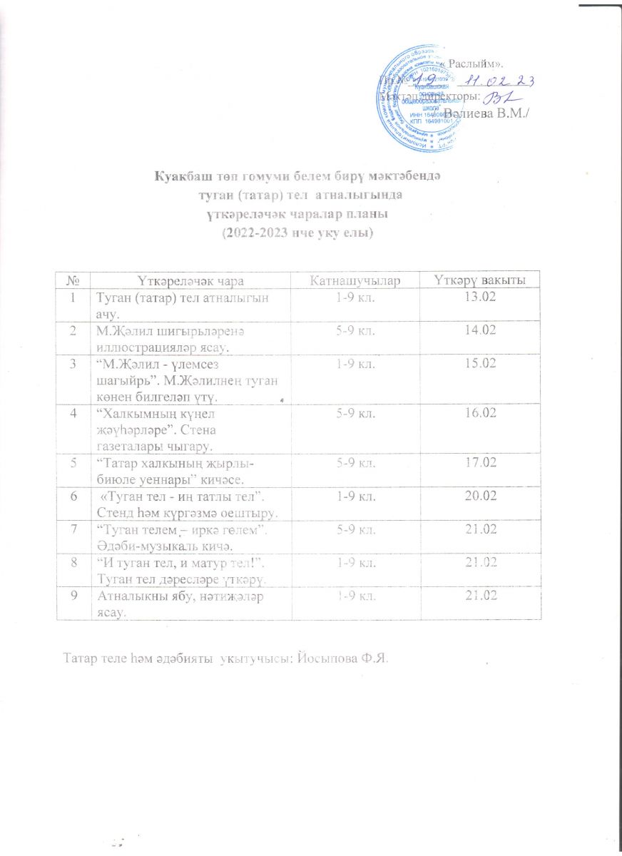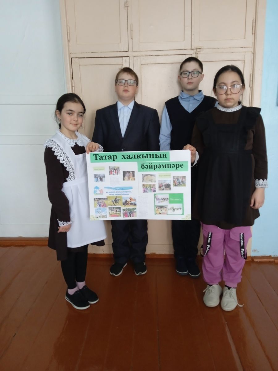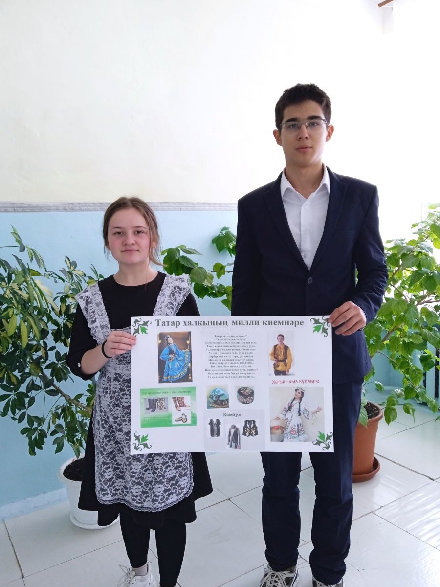 Атналыкның бүгенге көне “Халкымның күңел җәүһәрләре” исеме астында узды. 5-9 класс укучылары стена газеталары чыгардылар. Һәр класска аерым тема тәкъдим ителгән иде: 5 класс – “Татар халкының бәйрәмнәре”, 6 класс – “Хатын-кызларның бизәнү әйберләре”, 7 класс – “Татар халкының музыка кораллары”, 8 класс – “Татар халык ашлары”, 9 класс – “Татар халкының милли киемнәре”. Бу эш укучыларда милли мирасыбыз белән кызыксынуны арттыруга ярдәм итә.