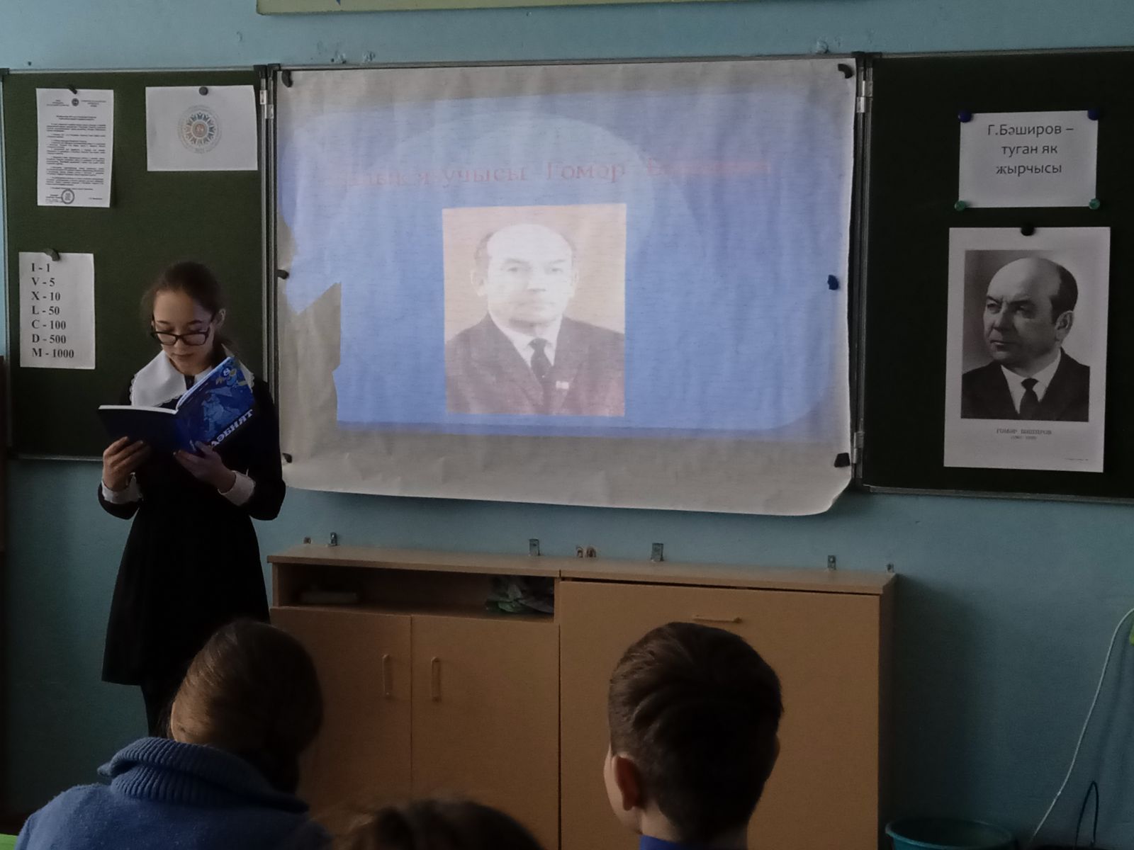 В этом году исполнилось 120 лет со дня рождения знаменитого татарского писателя Г.Баширова. В связи с этим учащиеся 5-7 классов приняли участие в мероприятии, посвященном Г.Баширову. Они познакомились с жизнью и творчеством писателя, читали отрывки из его произведений. Обучающиеся погрузились в атмосферу нашей истории, обычаев и традиций, получили положительные эмоции и новые знания.