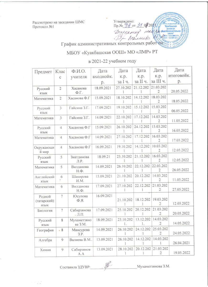 Расписание уроков, графики контрольных работ/ Дәресләр тәртибе, контроль эшләр графигы