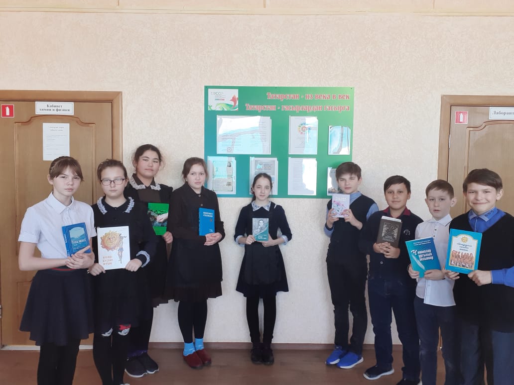«Туган телләр һәм халыклар бердәмлеге» елы уңаеннан чаралар уздыру дәвам итә. Бүген, 12 март көнне мәктәп китапханәчесе Мөхәммәдиева Н. М. 5 нче сыйныф укучылары белән берлектә «Мин татар китабын яратам» акциясе уздырды. Укучылар бер-берсен үзләре яратып укыган татар китаплары белән таныштырдылар. Китаплардан үзләренә иң ошаган өзекләрне укып күрсәттеләр. Чара «Туган телләр һәм халыклар бердәмлеге» елына багышлап ясалган стенд янында узды.«Продолжаются мероприятия, приуроченные к Году «Родных языков и народного единства». Сегодня, 12 марта, школьный библиотекарь Мухаммадиева Н. М. с пятиклассниками провела акцию «Я люблю татарскую книгу». Учащиеся ознакомили друг друга с книгами, которые понравились им самим. Прочитали отрывки из любимых произведений. Акция прошла возле стенда, посвященного году «Родных языков и народного единства»