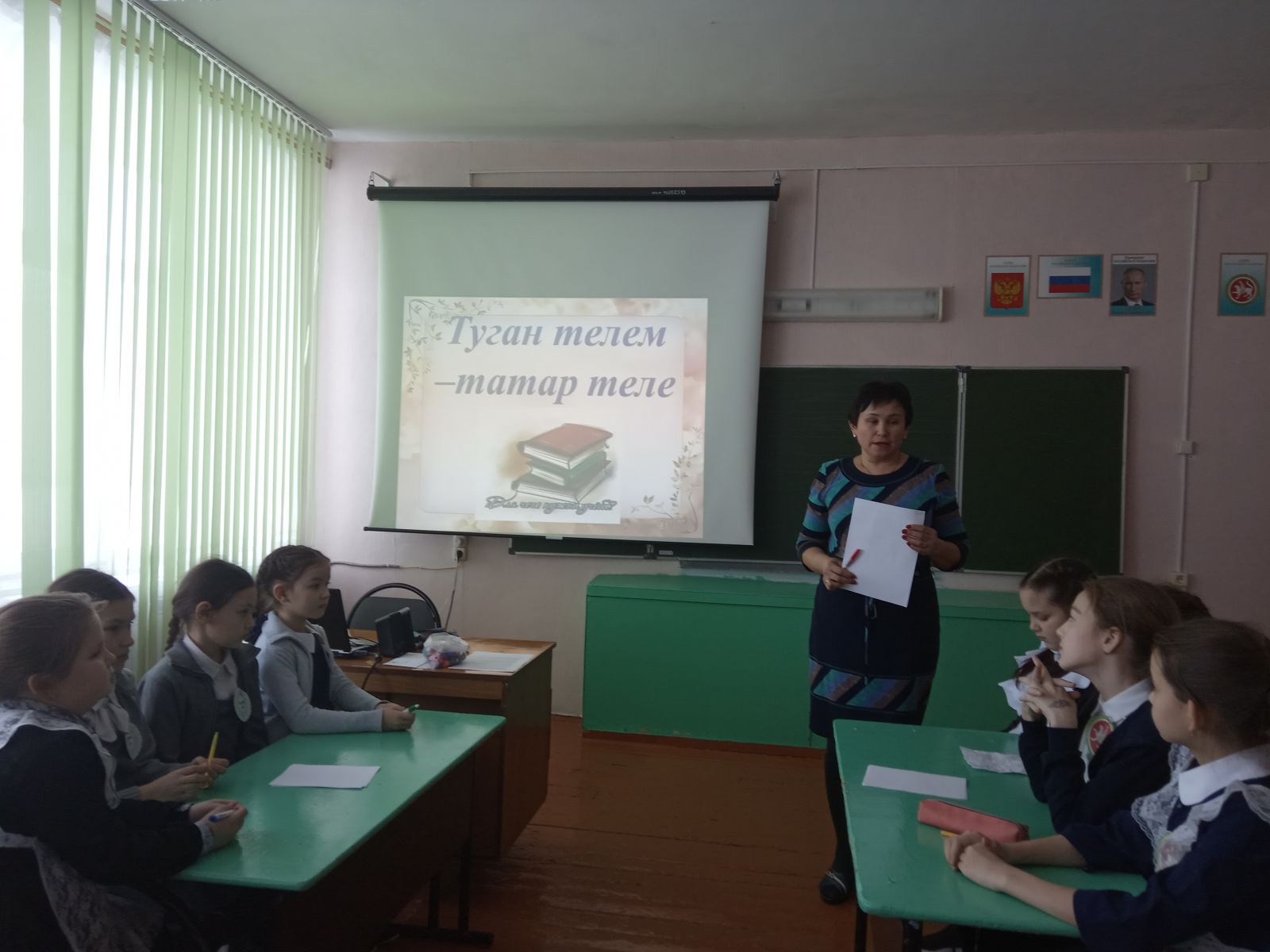 3нче февраль көнне 3 һәм 4 сыйныф укучылары арасында “Туган телем – татар теле” дигән тема астында КВН үткәрелде. Укучылар татар теле белән бәйле булган бәйгеләрдә көч сынаштылар. Болар арасында татар исемнәре уйлау, сүзләрнең синоним һәм антонимнарын табу, тизәйткечләр әйтү, иҗади бирем, интеллектуаль һәм музыкаль биремнәр дә бар иде. Бәйгедә катнашучылар туган телне өйрәнүдә тирән белемнәрен күрсәттеләр. 2 балл аерма белән 3нче сыйныф укучылары җиңү яуладылар.3 февраля между учащимися 3 и 4 классов был проведен КВН под названием «Мой родной язык –татарский язык». Ученики соревновались в конкурсах, посвященных татарскому языку. Среди них были такие конкурсы, как: «Татарские имена», «Синонимы и антонимы», «Скороговорки», «Творческое задание», интеллектуальные и музыкальные конкурсы. Участники конкурса показали большие знания в изучении родного языка. С разницей в 2 балла победила команда учащихся 3 класса.