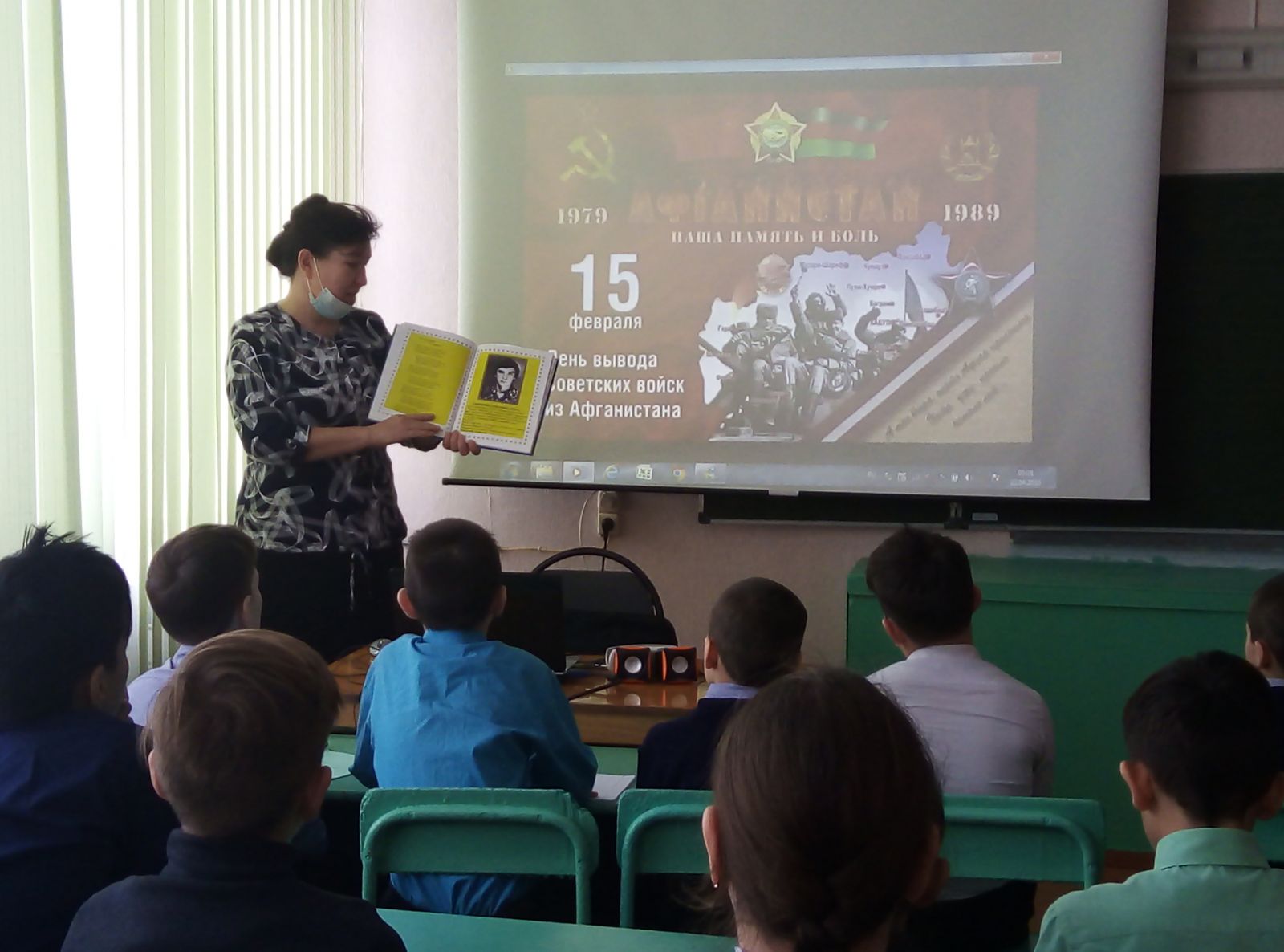 Сегодня в школе был организован Урок Памяти,посвящённый выводу советских войск из Афганистана.Мероприятие,проведённое педагогом – организатором школы Гирфановой Р.С. и учителем музыки Шакировой С.А., заставило ещё раз задуматься всех присутствующих о том,как важно,чтобы нашу мирную жизнь не омрачали вести с полей сражений, а в дома простых мирных жителей не приходили похоронки на близких нам людей. Ребята перелистали Книгу Памяти с фамилиями земляков , посмотрели презентацию о той страшной, трагической странице нашей истории. Спасибо всем ,кто отдал свои жизни за наше мирное небо, вечная им память.Оставшимся в живых героям войны-здоровья, жизненной энергии и понимания.