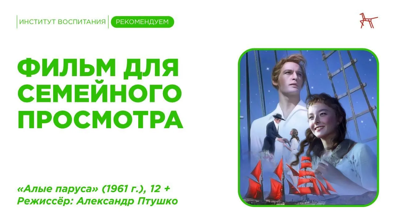 Фильм «Алые паруса» — это экранизация одноимённой повести Александра Грина. Добрая и светлая история о мечте, вере и любви. Главная героиня, Ассоль, с детства верит, что однажды за ней приплывёт корабль с алыми парусами. Многие считают её мечту наивной, но именно эта вера помогает ей сохранить чистое сердце и надежду. Фильм даёт понять, как важно не отказываться от своей мечты и оставаться добрым человеком, даже если окружающие не всегда вас понимают.