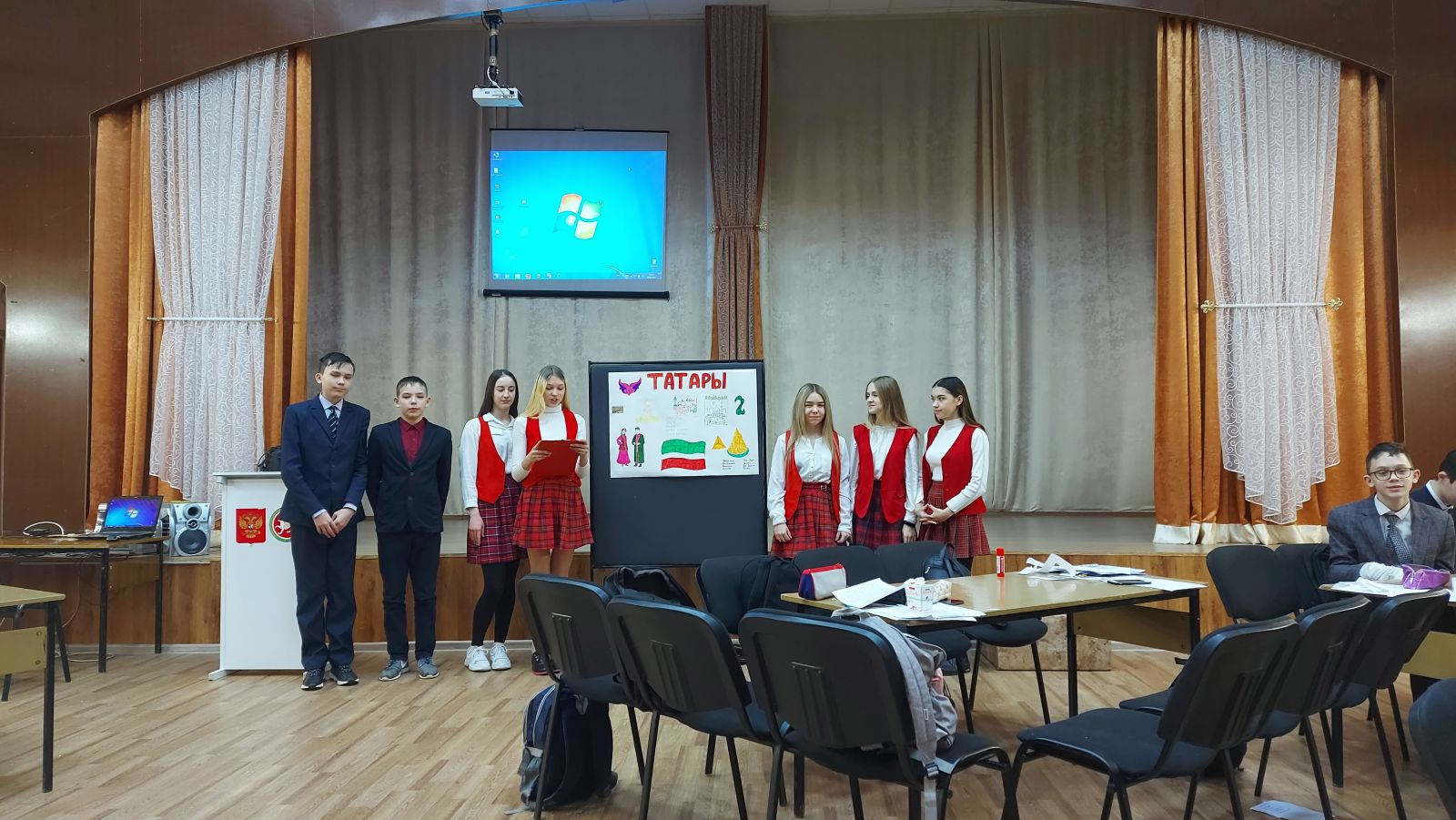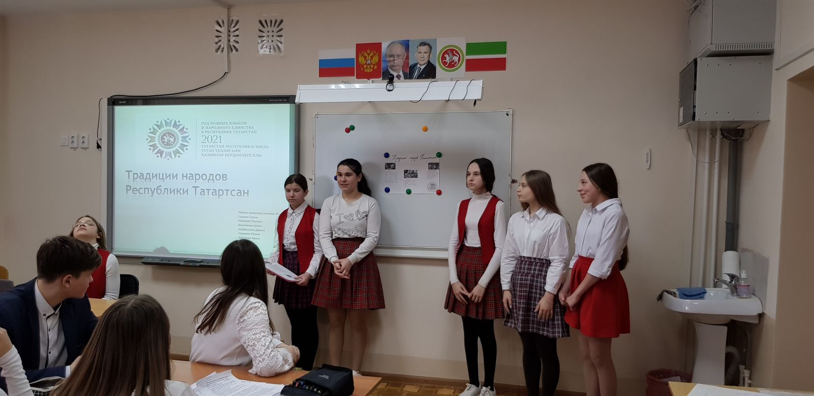 В рамках года родных языков и народного единства, в 7 классе (классный руководитель – Родионова Е.В.) прошла защита групповых проектов по теме «Многонациональный Татарстан». Целью данного мероприятия стала - культурологическое развитие учащихся в процесс познания исторических и духовных традиций, культур и языков народов Республики Татарстан. Ученики в группах подготовили мини-проекты о народах нашей республики, где отразили национальные костюмы, блюда, культуру, обычаи и традиции татар, чуваш и мордвы.