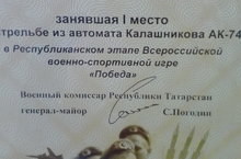 Поздравляем Хайретдинову А., ученицу 9 класса, занявшую 1 место по стрельбе из автомата Калашникова АК-74 в республиканском этапе Всероссийской военно-спортивной игры «ПОБЕДА»