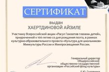 В рамках национального проекта "Культура для школьников" прошла акция "Расул Гамзатов глазами детей", приуроченная к 100-летию со дня рождения поэта. Ученица 2А класса Хаертдинова Айзиля приняла участие в проекте со стихотвлрением "Не обижайте матерей".