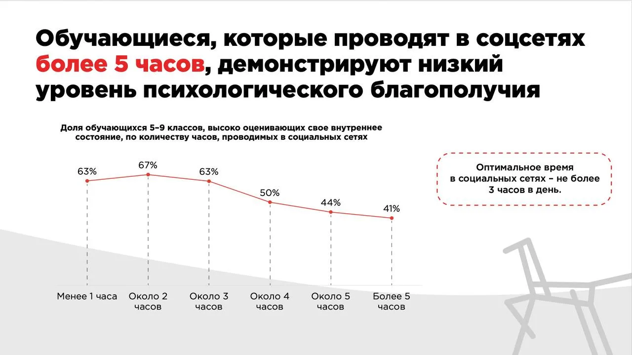 среди школьников 5–9 классов, которые проводят в соцсетях менее 1 часа в день, своё состояние как позитивное оценивают 63%;