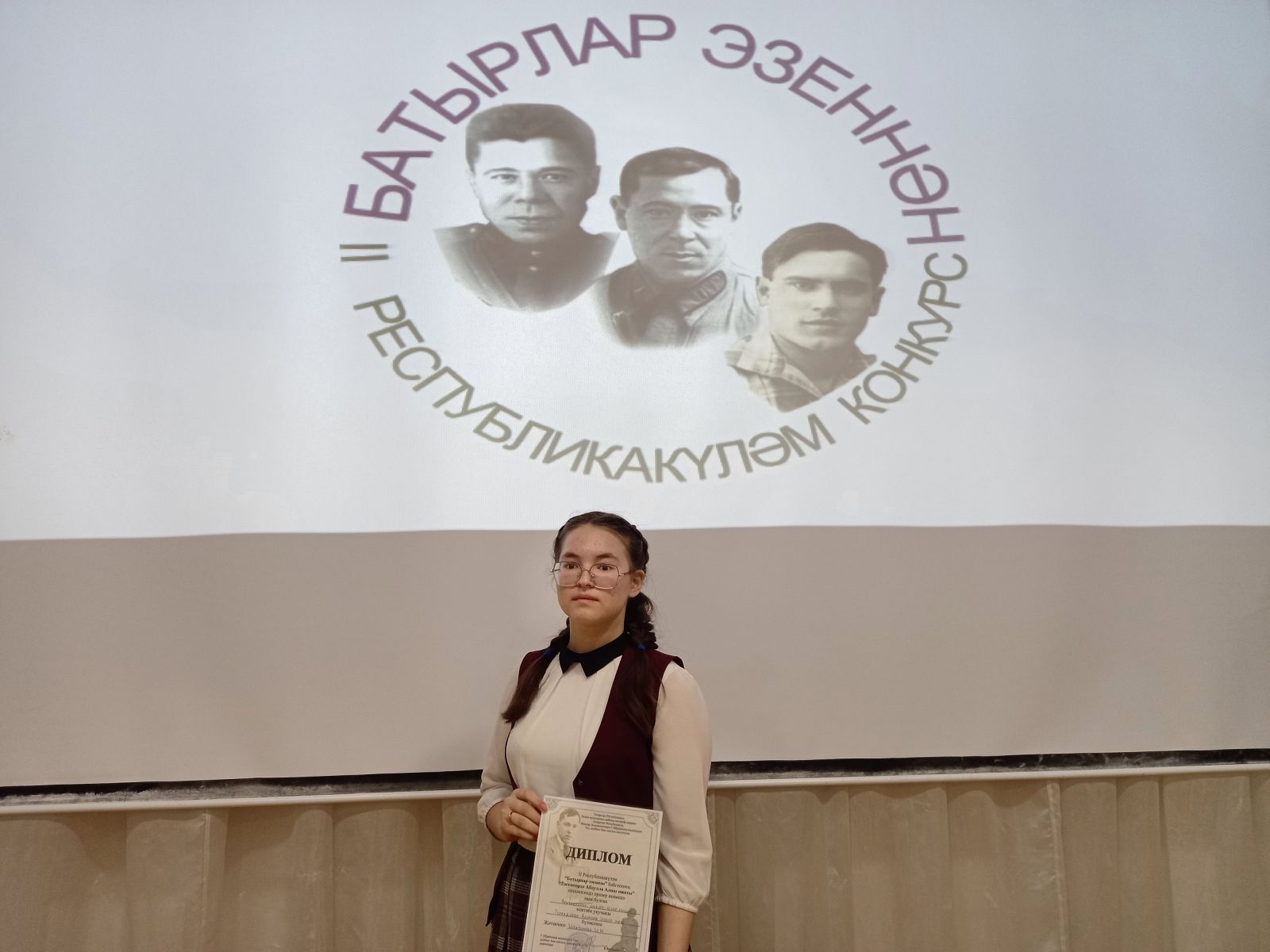 Ученица 7-го класса Гимадеева Альмира стала призером II Республиканского конкурса “Батырлар эзеннән”, посвященного поэту и писателю Абдулле Алишу. Желаем дальнейших успехов!
