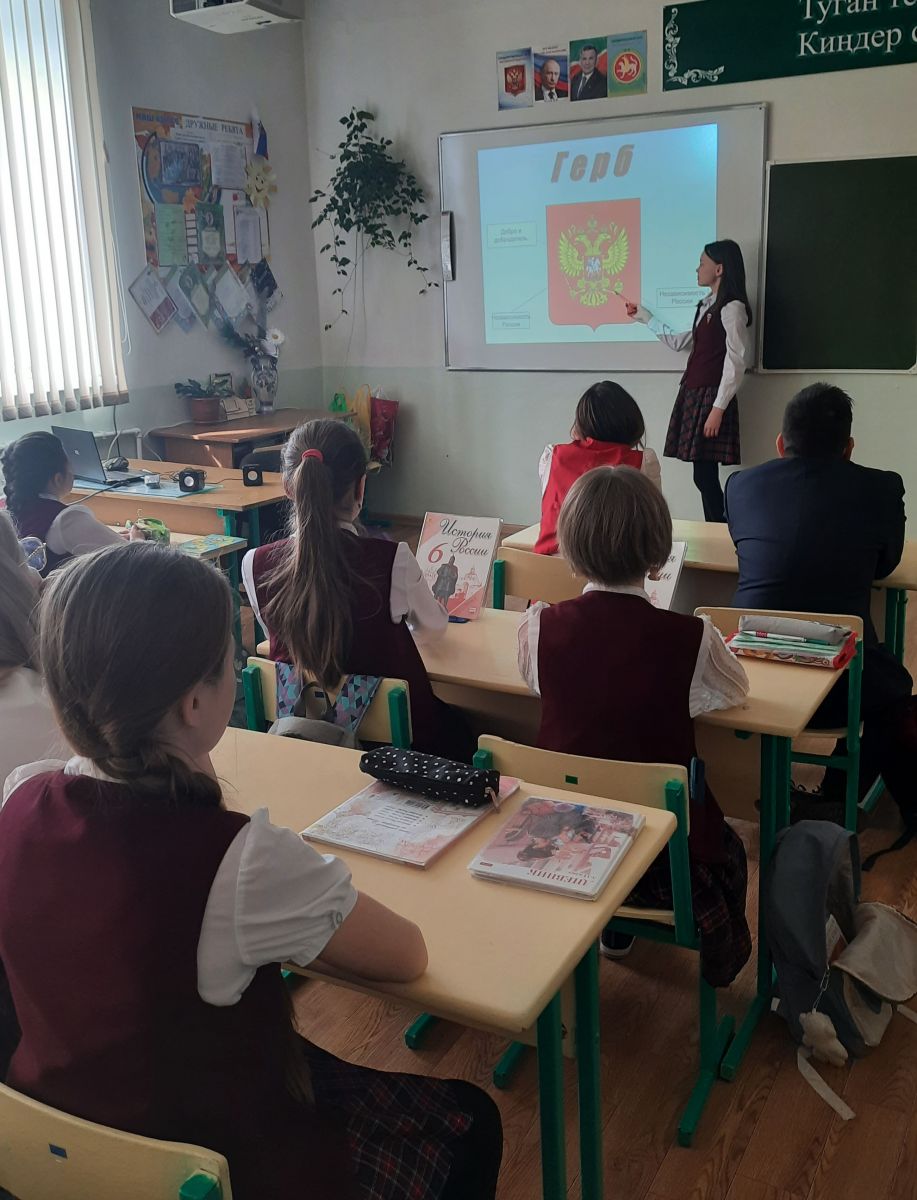 В 6В классе прошёл классный час, посвящённый символам РФ и РТ. По окончании классного часа учащимися был исполнен гимн РФ и РТ.