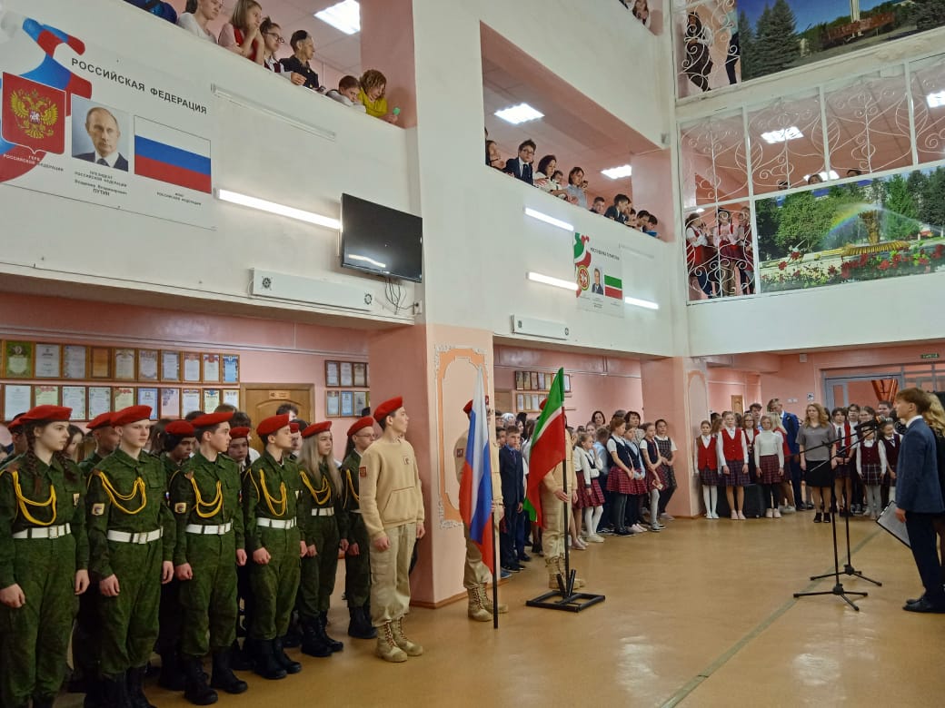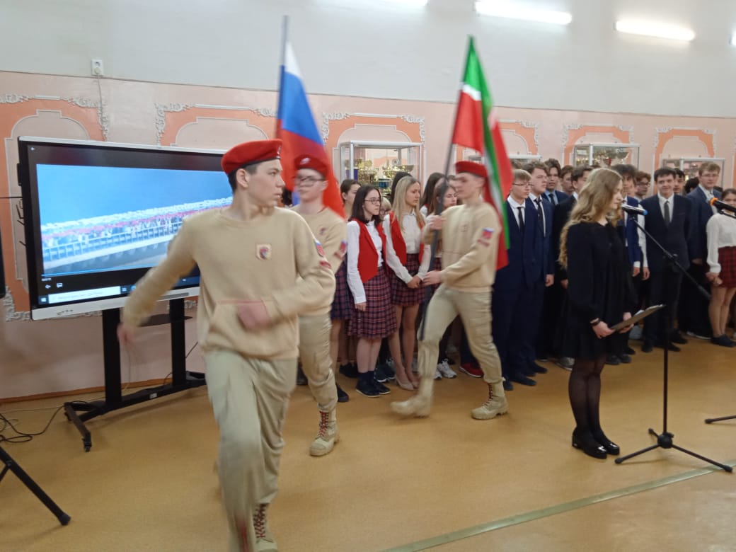 Право вынести флаги Российской Федерации и Республики Татарстан предоставилось ежегодным призерам муниципальных, зональных и республиканских смотров и конкурсов «Вперед, юнармеец!», «Победа», «Зарница», членам военно-патриотического клуба «Спартак» Ефременкову Илье, Орлову Даниилу и Хайруллину Ильнуру.