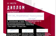 13.11.2015 года студенты нашего колледжа приняли участие в зональном этапе Республиканского интеллектуального турнира на антикоррупционную тематику «Честный Татарстан» и заняли там почетное третье место. Поздравляем участников команды:
