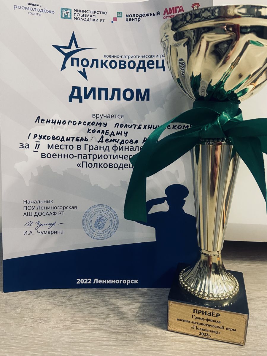 9 декабря 2022 года на территории автошколы ДОСААФ состоялся ГРАНД-финал военно-патриотических игр «Адмирал» и «Полководец». Четыре лучшие команды по результатам двухдневных игр приняли участие в захватывающем состязании. Ребята окунулись в атмосферу Великой Отечественной войны, на время смогли почувствовать себя солдатами советских войск, целью которых было уничтожение войск фашисткой Германии. Команды стреляли, расшифровывали код азбуки Морзе, отвечали на вопросы о великих советских полководцах, метали гранаты во вражеские танки, ловили и допрашивали немцев, после чего немцы подняли белый флаг! Команда Лениногорского Политехнического Колледжа успешно справилась с заданиями, и результатом этого стало 2 место в ГРАНД-финале!