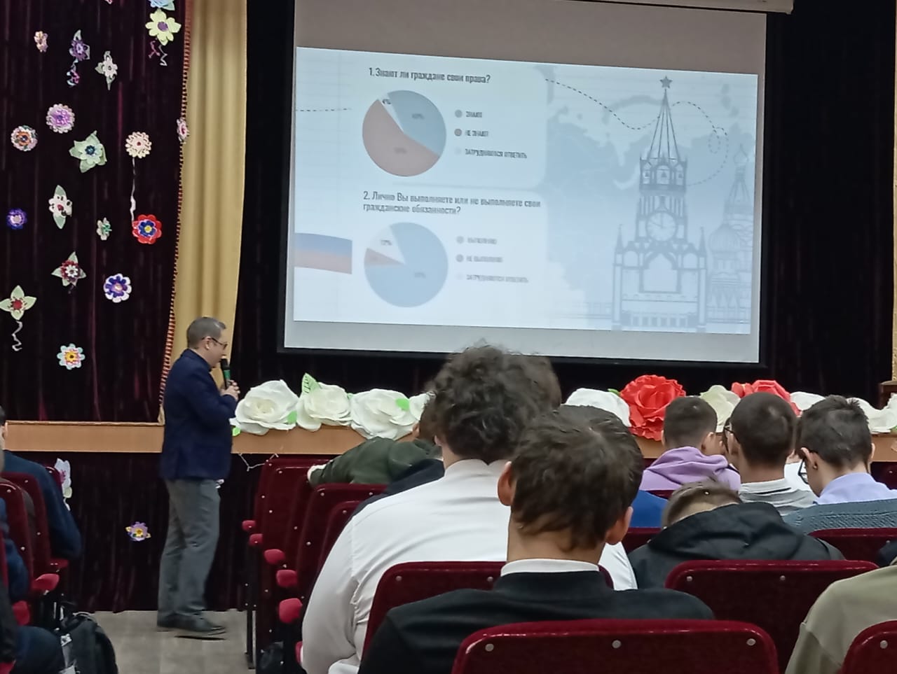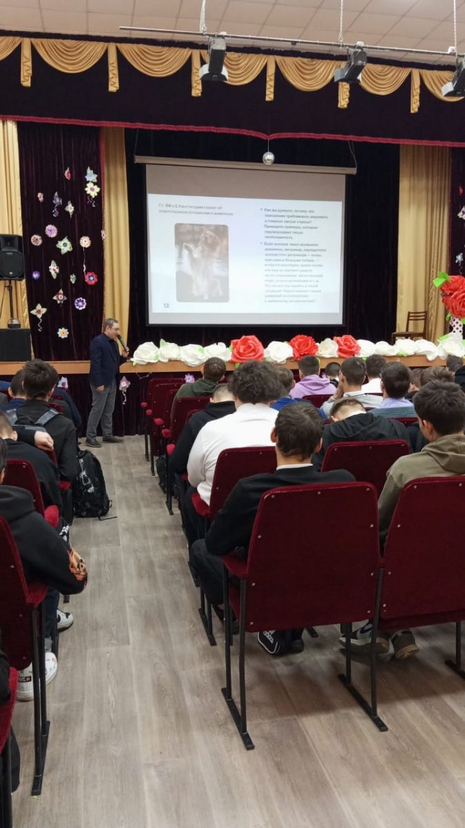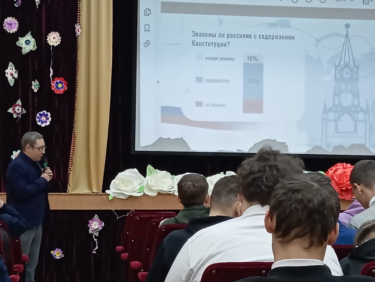 Всероссийский урок «Разговоры о важном» в Лениногорском политехническом колледже провёл учитель истории Панферов Антон Сергеевич 11 декабря 2023 года. Урок посвящён 30-летнему юбилею Конституции РФ, принятой в 1993 году. На уроке присутствовали студенты 1-4 курсов: они внимательно слушали преподавателя, активно включались в обсуждение злободневных вопросов. Что такое традиционные семейные ценности? Какие права и обязанности есть в нашей Конституции? Что значит забота о родителях на практике? и тому подобные вопросы.