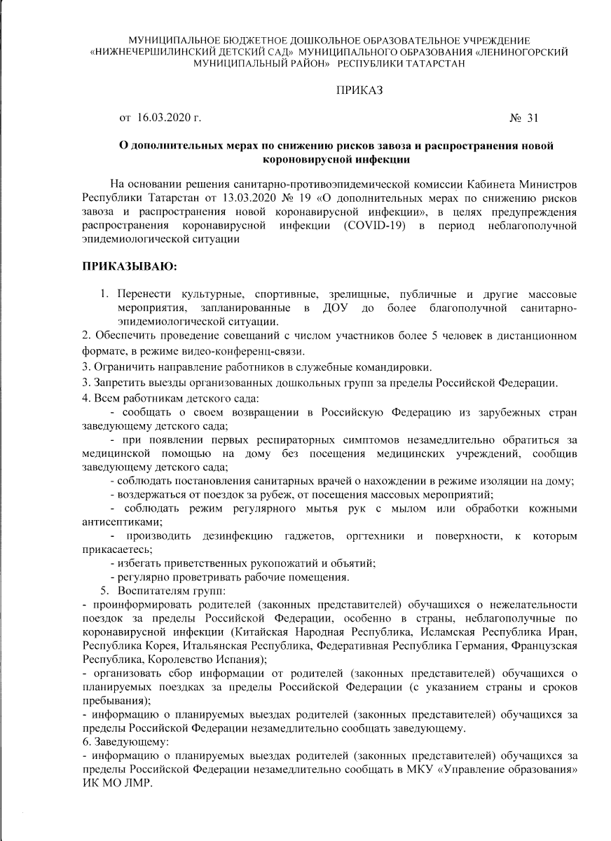 Приказ " О дополнительных мерах по снижению рисков завоза и распространения новой коронавирусной инфекции"