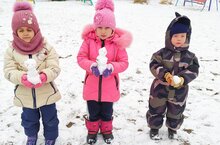 Снег, снег, снег над детским садом кружится. Наконец то и к нам пришел первый снег. Вечером начал летать такой крохотный. А утром проснулись, посмотрели в окно, а там такая красота! Повсюду лежит белоснежное пушистое покрывало, сотканное из миллионов сверкающих снежинок. Первый снег, какая красота радость детям, сколько всего интересного, забавного можно смастерить из снега. Ребята с большим удовольствием идут на прогулку. Гуляя на своем участке мы слепили первого снеговика, все ребята старались катали не большие снежные комы. И рада и счастлива вся детвора. Ведь столько много новых развлечений готовит всем зимушка-зима и лепка снеговиков, и игра в снежки, и катание с горки на санках, ледянках, даже можно поваляться вдоволь.