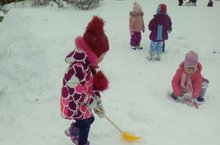 Прогулка с детьми зимой в детском саду – это уникальное явление. Согласно положению СанПиН 2.4.1.2660-13 «Санитарно-эпидемиологические требования к устройству, содержанию и организации режима работы в дошкольных организациях» подобное времяпрепровождение предусмотрено. Сегодня мы в ходе прогулки строили снежную горку. А завтра уже можно будеть прокатиться. Дети с удовольствием приняли участие в строительстве.