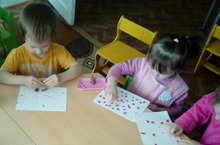 С целью научить надавливающим движением указательного пальца размазывать пластилин на картоне; формировать интерес к работе с пластилином; развивать мелкую моторику в младшей группе была организована лепка из пластилина.