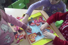 С целью научить детей умению правильно собирать целое изображение из отдельных кусочков, определять различные цвета предметов и их формубыла организована настольная игра.