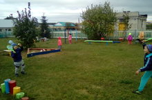 На свежем воздухе Алексеева О.В. с детьми провела "Весёлые старты" с обручем, мячами, скакалками. Дети были очень рады соревнованию и осеннему солнечному дню.