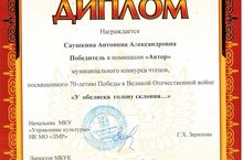 Саушкина А.А., учитель русского языка и литературы, руководитель школьного музея, на муниципальном конкурсе чтецов посвящённом 70-летию Победы в Великой Отечественной войне "У обелиска голову склоняю", стала победителем в номинации "Автор". Поздравляем!