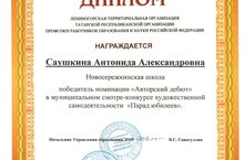 Учитель русского языка и литературы, руководитель школьного музея Саушкина А.А. 10.02 2015 г. приняла участие в муниципальном смотре художественной самодеятельности «Парад юбилеев» среди работников образования и стала победителем в номинации «Авторский дебют». Поздравляем!