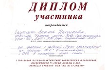 Ученица 7 класса Саушкина А. (рук. Саушкина А.А.) приняла участие в 1 зональной научно-практической конференции, посвящённой 75-летию Победы, организованной на базе "Лицея №12" г.Лениногорска.