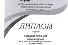 Саушкина А.А., учитель русского языка и литературы, стала лауреатом всероссийского дистанционного творческого конкурса педагогов в номинации "Поэзия" (Литобраз. Музы). Поздравляем!
