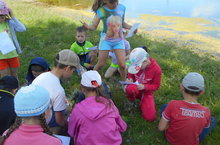 Воспитатели для детей организовали экскурсию на водоём. Они познакомили с правилами поведения около водоёмов, правилами и купания и загара. И конечно же играли в игры, рисовали подводных жителей.