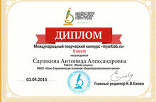 Поздравляем Саушкину А.А., учителя русского языка и литературы, занявшую 2 место в Международном дистанционном творческом конкурсе «Издание» для педагогов с циклом стихотворений «Малая родина». Дальнейших успехов!