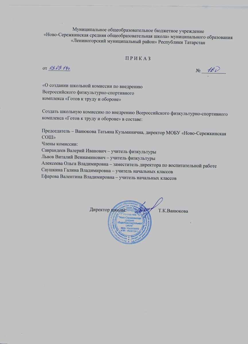 Приказ о создании комиссии в школе по внедрению Всероссийского физкультурно-спортивного комплекса