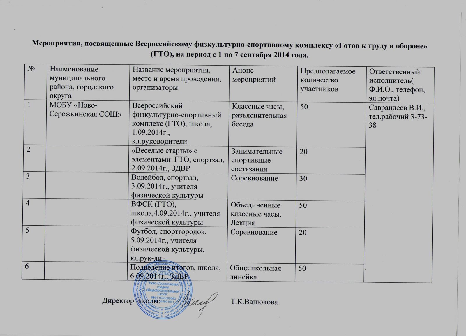Мероприятия, посвященные ГТО на период с 1 по 7 сентября 2014 года