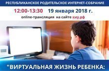 Во исполнение плана работы Министерства образования и науки Республики Татарстан 19.01.2018 с 12.00 до 13.30 состоится Республиканское родительское интернет – собрание «Виртуальная жизнь ребенка: интернет – друг или враг?». Он-лайн трансляция собрания будет вестись на сайте Казанского инновационного университета имени В.Г.Тимирясова.