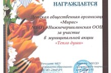Детская общественная организация "Мирас" награждена дипломом за участие в муниципальной акции "Тепло души". Поздравляем педагога организатора Сайфиеву Т.Ш. и учащихся за участие. Молодцы!