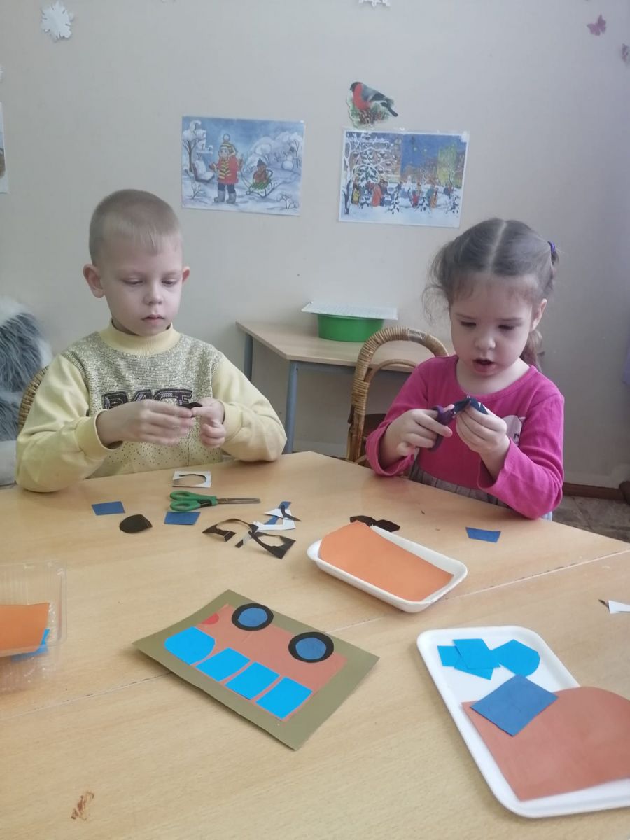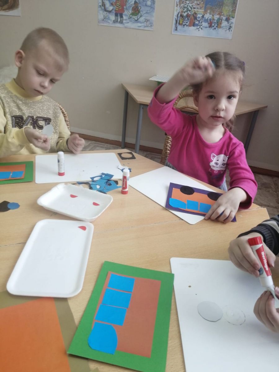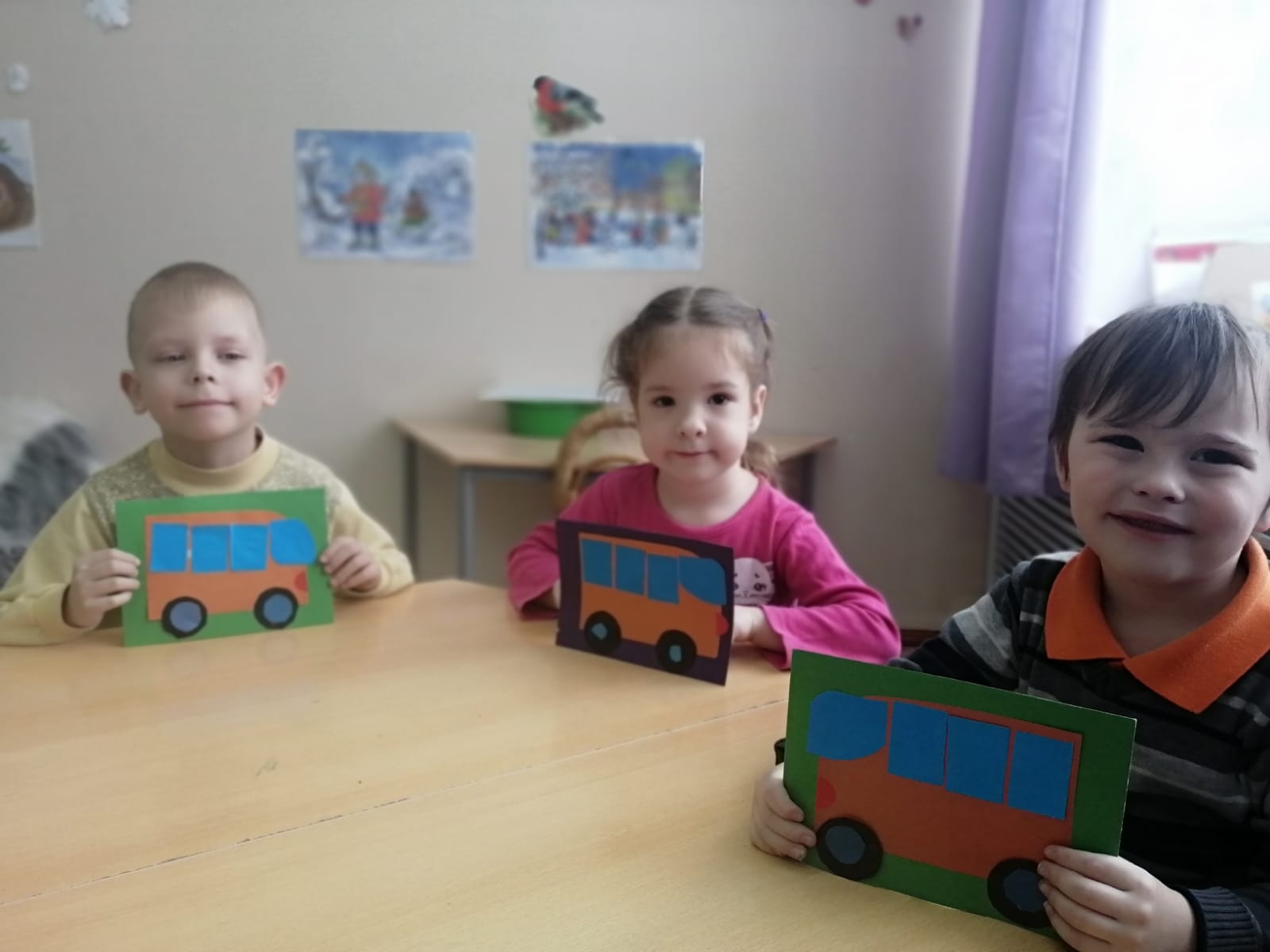 Материалы и оборудование: игрушечный автобус, иллюстрации автобус, дорога и пр., бумага размером ½ альбомного листа для основы (фона), набор цветной бумаги (прямоугольные полоски, квадраты, прямоугольники), ножницы, клей, салфетки.