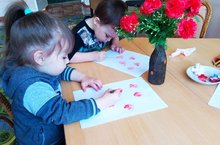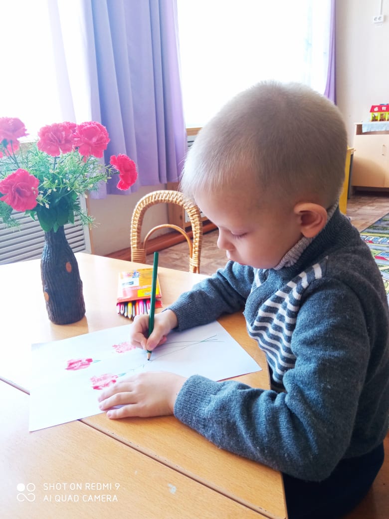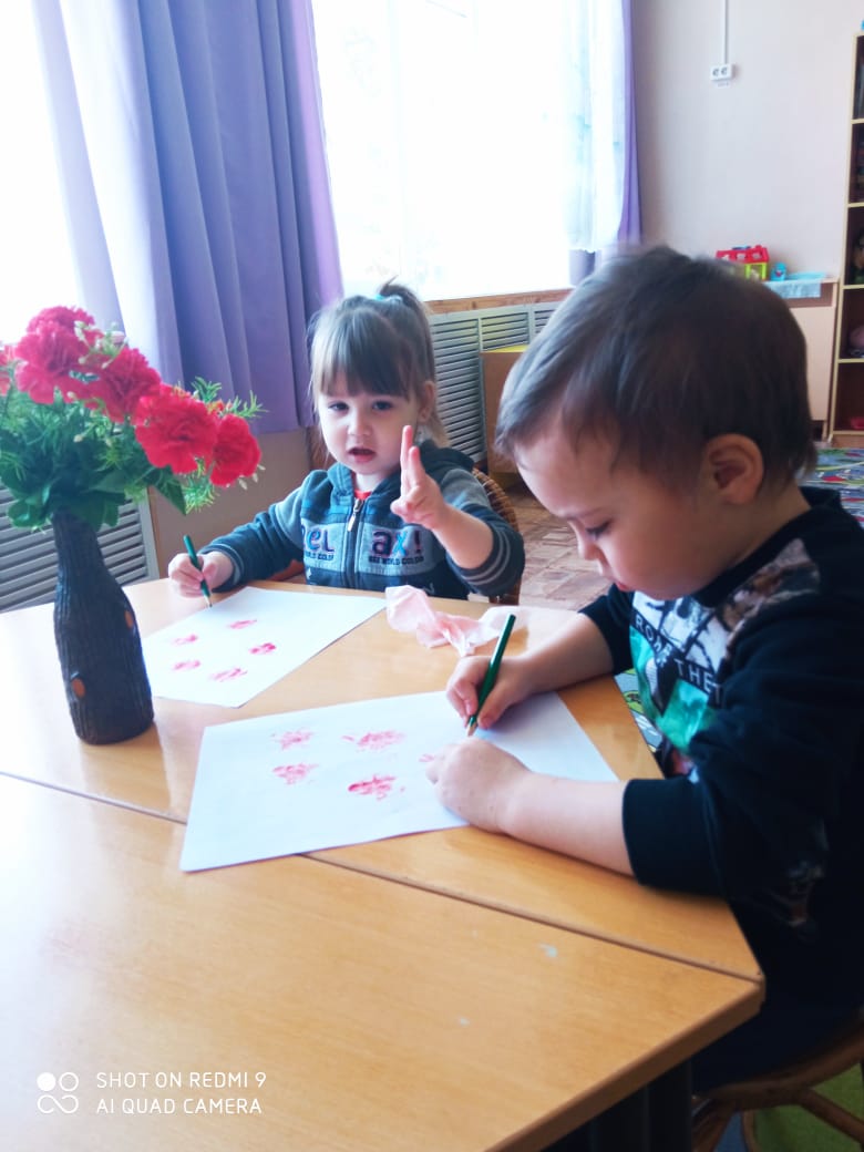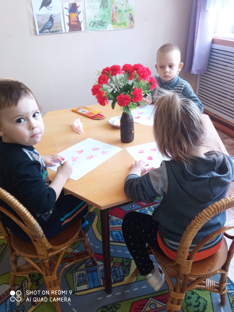 Воспитанники детского сада на занятиях по рисованию рисуют цветы гвоздики - символ Победы.