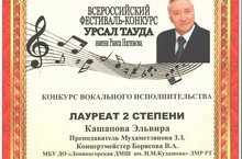 Поздравляем Кашапову Эльвиру, лауреата 2 степени Всероссийского фестиваля-конкурса "Урсал тауда-2021" , в номинации вокальное исполнительство, преп. Мухаметзянова З.З., концертмейстер Борисова В.А.