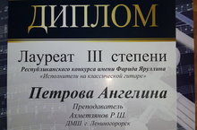 В Альметьевске прошел Республиканский конкурс им. Ф. Яруллина в номинации "Исполнители на классической гитаре". Учащаяся преп. Ахметзянова Р. Ш. - Петрова Ангелина стала на этом конкурсе Лауреатом III степени. Поздравляем , желаем дальнейших творческих успехов!