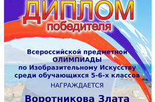 14 декабря 2019 года Образовательным порталом Ника была проведена очная Всероссийская предметная олимпиада по Изобразительному Искусству среди обучающихся 5-6 классов детской художественной школы. Время для прохождения олимпиады составляло 60 минут. Было предложено 20 заданий на тему декоративно-прикладного творчества, также необходимо было соотнести репродукции картин художников с автором создателя. В данной олимпиаде приняла участие Воротникова Злата, ученица 1 «Б» класса основного отделения (преподаватель Хохуля Наталья Олеговна). Злата получила Диплом победителя со 100% результатом, продемонстрировав хорошие творческих способностей и большой запас знаний по теории изобразительного искусства.