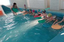 Бассейн 19.01.2017 В ДОУ имеется бассейн, где ежедневно проходят занятия плаванием, окупывание детей, работа по профилактике плоскостопия и сколиоза. Бассейн оборудован в соответствии с требованиями СанПина. Имеется достаточное количество игрового раздаточного материала: индивидуальные дощечки, плавательные круги, надувные мячи и качели, пластмассовые и резиновые игрушки для игр с водой - шарики, уточки, лейки, игрушки-забавы. Ведет занятие инструктор по плаванию Бекмурзина Н.Н.