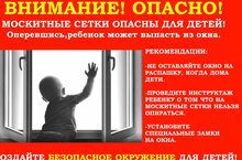- НИКОГДА не рассчитывайте на москитные сетки! Они не предназначены для защиты от падений! Напротив — москитная сетка способствует трагедии, ибо ребёнок чувствует себя за ней в безопасности и опирается, как на окно, так и на неё. Очень часто дети выпадают вместе с этими сетками.