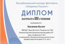Обучающийся объединения "Гармония", Касимов Булат, принял участие в Республиканском конкурсе-фестивале "Патриоты России"...
